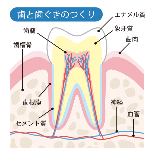 歯の根の周りには繊維の束でできた膜「歯根膜」があります。歯根膜は、歯を支えるクッションの役割をしているとともに、噛んだときに硬いもの、柔らかいものなどを判断する働きもあります。