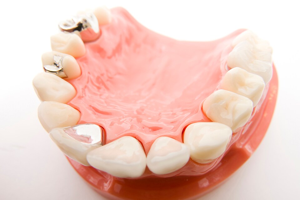 つめ物・かぶせ物の素材はさまざまなものをご用意しています。強度などを考慮すると何よりも歯に負担の少ない素材はゴールドですが、色が目立つのが欠点です。そのため、基本的にはCAD/CAM冠や銀歯のつめ物をご提案しています。