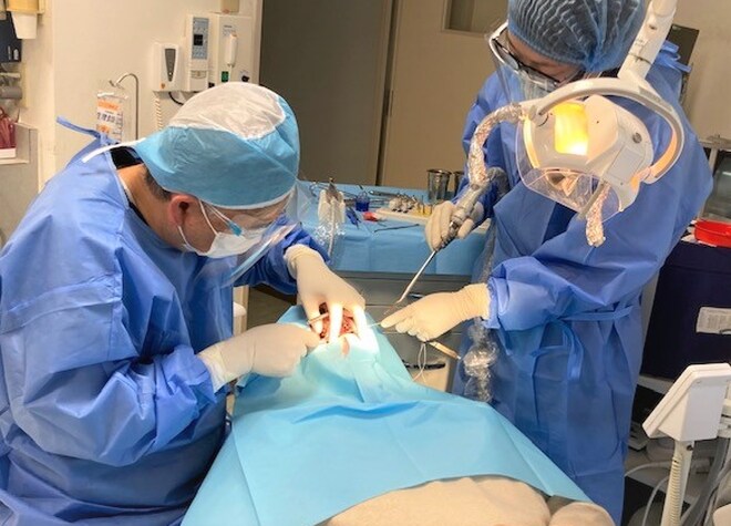 歯茎を開いて顎の骨に穴をあけ、インプラント体を埋め込みます。手術時間は埋め込む本数や抜歯の有無によって変わります。