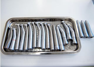 具体的には、治療に使用した器具はすべて水洗い後に超音波洗浄を行い、その上で高圧蒸気滅菌器にて滅菌処理を施しています。歯を削るためのタービンも患者さまごとに交換し滅菌を行っていますので、使用済みの器具をそのまま使い回すことはありません。もちろん、コップやエプロンなどの滅菌できないアイテムには使い捨てタイプの製品を採用しています。