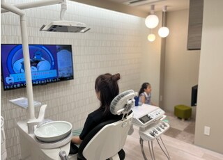 診療室の中にお子さま用ビデオスペースがあります。お子さまはそこでビデオを見たりご持参のアプリを見たりしてご家族の診療が終わるのを待っていただけます。ご家族も見えるところにお子さまがいるのは、気が休まるかと存じます。