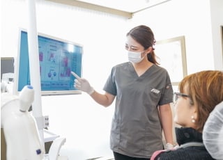 何をされるか分からないまま、お口の中を触られるのは不安ではないでしょうか。当院では、治療に着手する前に説明の時間を設け、レントゲン画像を見ながらていねいにお話をしています。入れ歯とブリッジ、インプラントの違いなど、治療方法についてご説明をする際には、より分かりやすくお伝えできるようタブレットで動画をお見せしています。