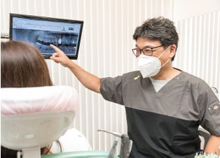 お口のトラブルの治療方法は一つではございません。当院は、患者さまのお口の状態に合わせて可能な限り治療方法を提示し、それぞれのメリット・デメリットも含めて内容をていねいにお話ししています。その際は、レントゲン写真などの目で見て分かりやすい資料をご覧いただきながら、より理解していただけるよう努めています。