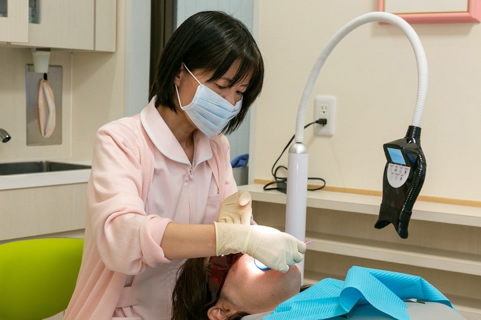 クリーニングは歯科衛生士が主に対応し、コミュニケーションを取りながら処置を進めてまいります。クリーニングはホワイトニングの作用を高めるだけではなく、口内環境を整えることにもつながりますので、ホワイトニング後も定期的に受けていただければ幸いです。