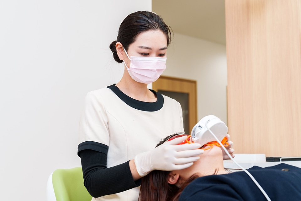 当院では複数のホワイトニング方法をご用意しており、その中から患者さまのご要望に合わせてご提案いたします。例えば短期間で歯を白くしたい方や、なるべく手間を省きたいという方には、歯科医院で施術を行うオフィスホワイトニングが向いているでしょう。当院ではオフィスホワイトニングの作用を高めるため、専用の機器を導入しております。