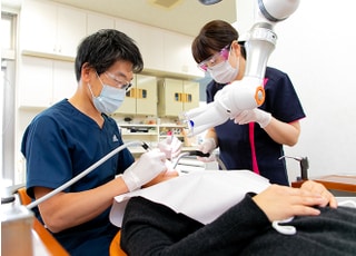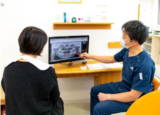 患者さまのお話をお聞きしたら、次にレントゲン撮影や口腔内写真撮影、歯周病の検査などを行います。いくつかの治療内容を提案できる場合は、それぞれのメリット・デメリットをお伝えし、患者さまに決めていただくという流れです。