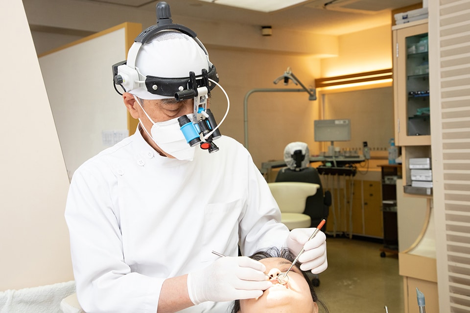 歯周ポケットの診査などを行い、患者さまのお口の状態を確認します。悩みごとなどがあれば気兼ねなくご相談ください。