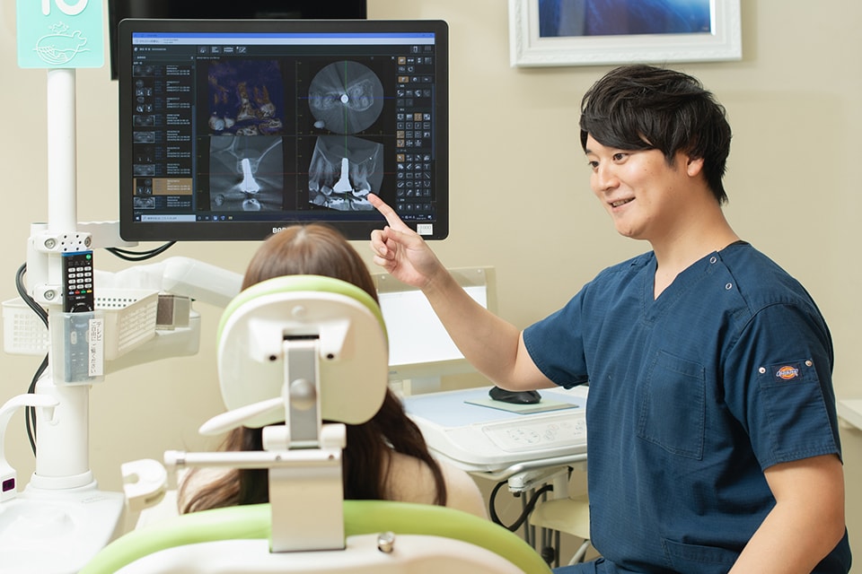 ていねいな検査でリラックスして治療を受けていただけるよう心がけ、歯科用CTでの精密な検査で骨のレベル状態などの詳細を確認し、治療内容を診断します。その状況や治療方針をわかりやすくご説明し、金額についても事前にお伝えします。ご納得いただいた上で治療に進みます。