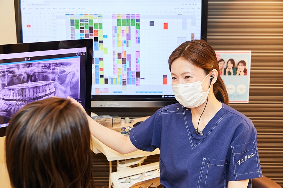 当院は歯科衛生士担当制を採用しています。担当制にはさまざまなメリットがあると考えており、例えば、患者さまの生活習慣やお身体の状態などを把握した上で、お口のチェックや口内環境のアドバイスを行える点がその一つです。