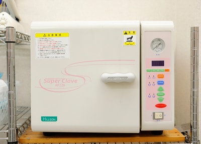 当院では、タービンやハンドピースといった治療器具は洗浄機できれいにした後、高温高圧蒸気で細菌を死滅させるクラスBのオートクレーブで滅菌処理をしています。