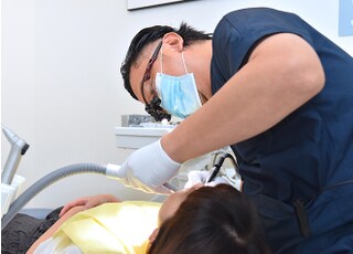 例えば、患者さまにできる限り痛みを感じさせないために、麻酔注射の段階からしっかりと配慮をしています。最初に歯茎へ表面麻酔を行い、細い注射針を付けた電動注射器を用いてゆっくりと注射することで、刺激を抑えた麻酔処置を心がけました。診療中は小まめにお声がけをして、患者さまのペースに合わせて段階的に進めることにより、不安や恐怖心を緩和できるようにもしています。