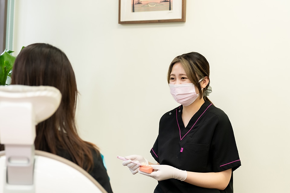 汚れがたまっていたり、歯の根元や奥歯などで磨き残しが起きやすい部分があったりした場合は、鏡を使ってその部分を一緒に確認し、お手入れ方法のコツをしっかりとご説明いたします。場合によってはアニメーションも活用して、予防の大切さをお伝えしております。