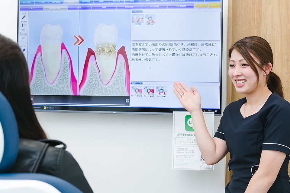 お口のトラブル予防では、歯科医院で行うメンテナンスなどに加え、ご自宅でのセルフケアも重要です。そこで当院は、ブラッシング指導に注力し、患者さま一人ひとり異なるお口の環境に合わせたアドバイスを行います。まずは汚れの染め出しを行い、鏡を見ながら磨けていないところを確認し、模型などを使ってしっかり磨ける方法をお伝えしていきます。